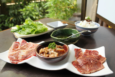 その日に店長が厳選したお肉3品とチシャ菜、ご飯(小)とワカメスープ(小)がついた日替わりランチです。